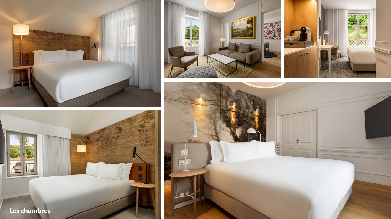 Dans chaque chambre, la tête de lit est inspirée d’un dessin du peintre impressionniste Corot ou des motifs de la toile de Jouy, rappelle subtilement l’empreinte historique et artistique du lieu