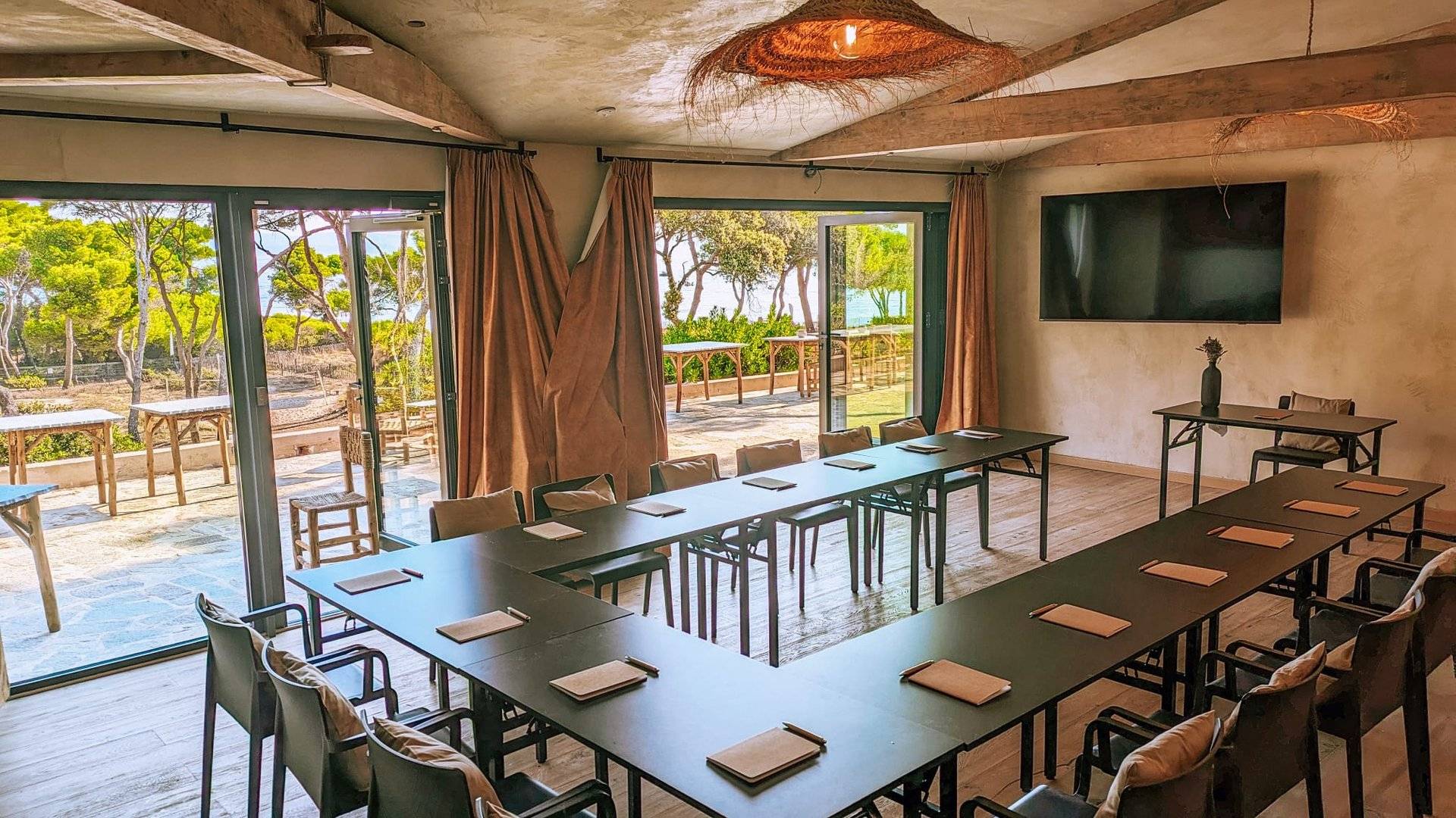 Une atmosphère inspirante face a la mer et ouvertes sur une vaste terrasse, En U, en non conventionnel, théâtre, cocktail, il est possible de moduler les 3 salles comme bon vous semble.