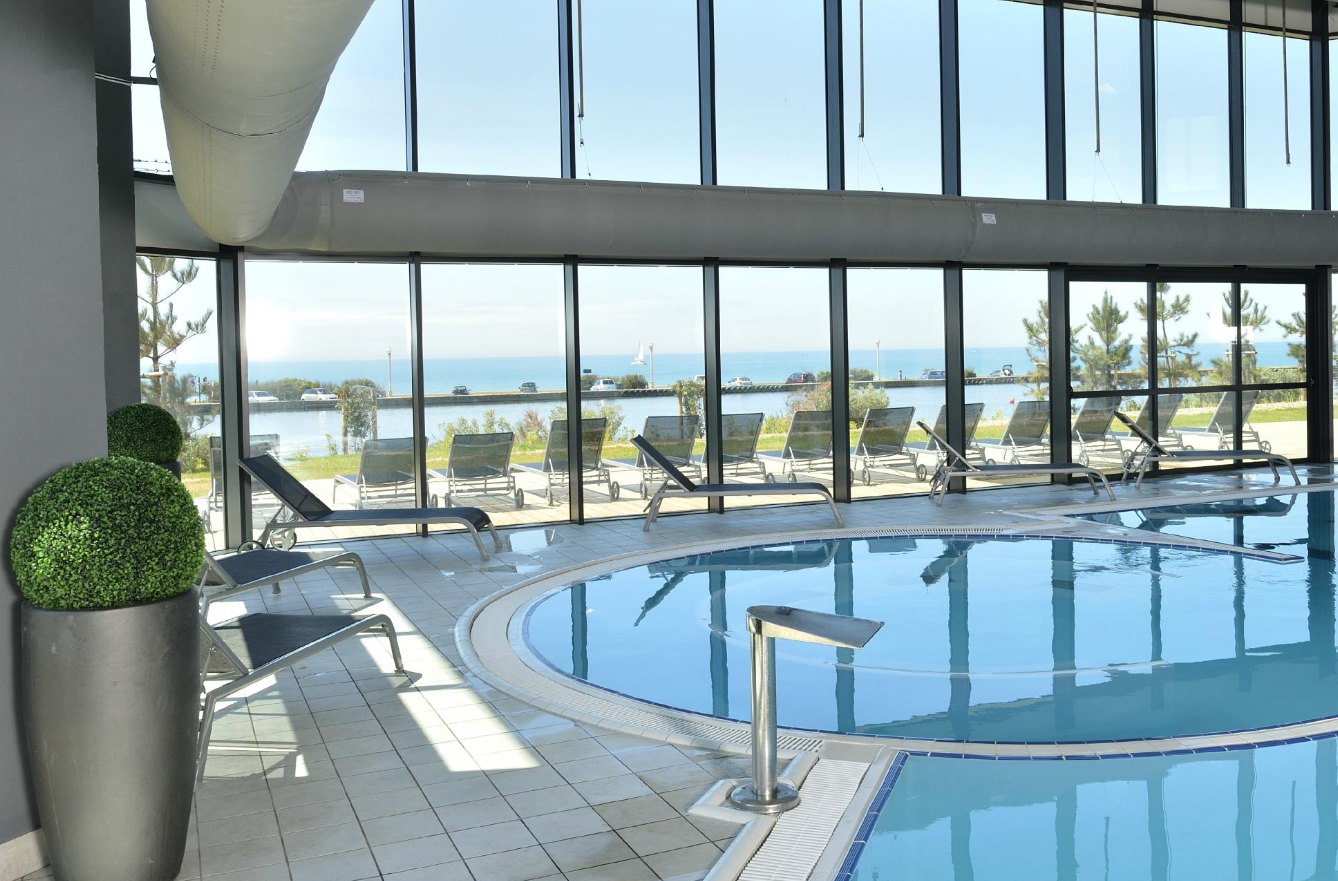 Le dépaysement et l’invitation au voyage sont garantis grâce aux larges baies vitrées qui offrent une vue imprenable sur la piscine et ses cabines de plage des années 30.