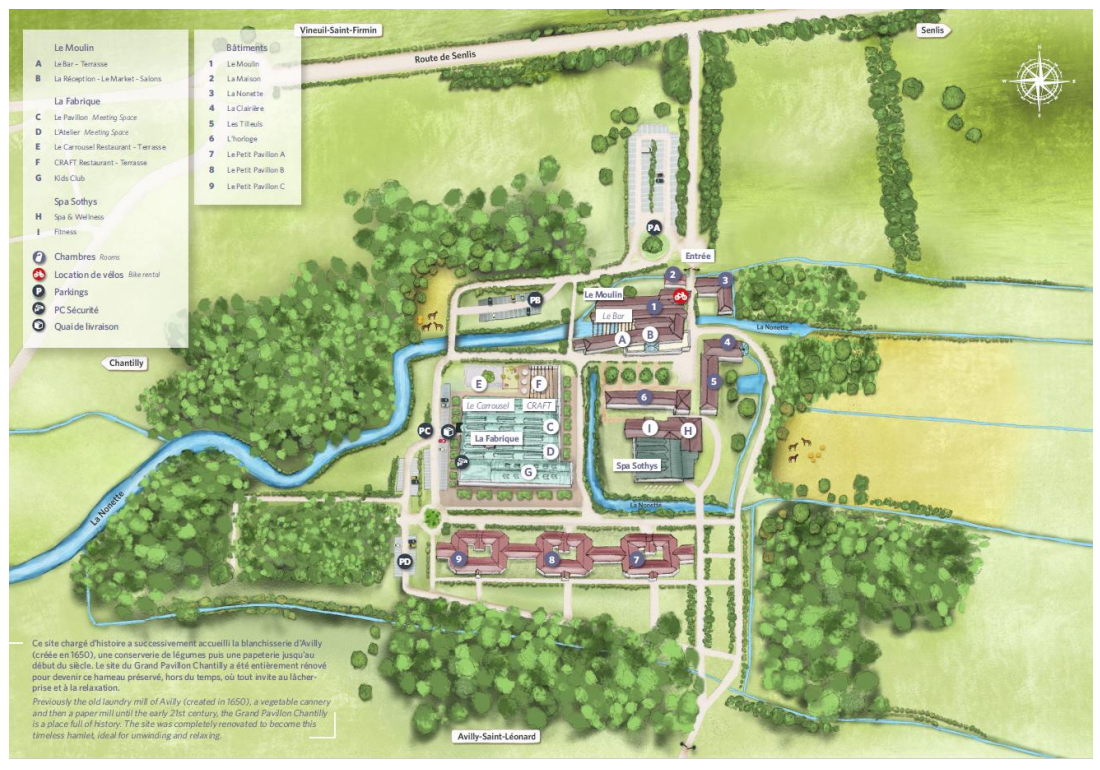 Le Grand Pavillon Chantilly, hameau de huit bâtiments en pierre authentique du 18ème siècle, est niché dans un parc de 17 hectares au cœur de la forêt du Château de Chantilly, et se situe à 20 minutes de l’aéroport Paris Charles de Gaulle et 45 minutes de Paris