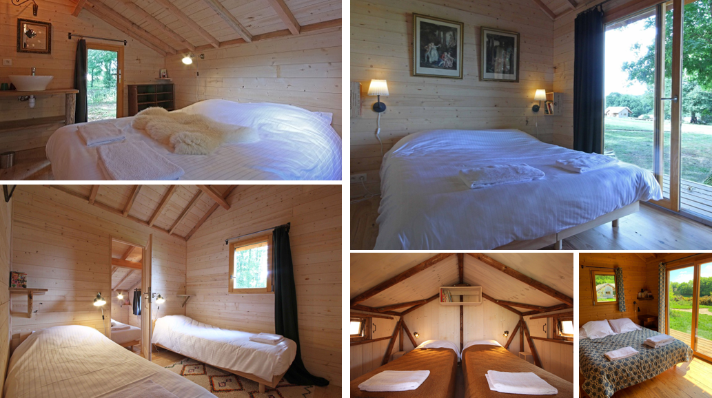 Les cabanes sont construites en bois douglas du limousin. Elles sont isolées en laine de mouton, elles comportent une pièce de vie avec cuisine, deux à six chambres, des toilettes séparées, une à trois salles de bain et une spacieuse terrasse. Elles sont très équipées et disposent de tout le confort nécessaire, du sèche-cheveux à la machine à café.Elles sont chauffées par des radiateurs mais disposent aussi d’un poêle suédois à bois « Jotul » pour l’agrément.
