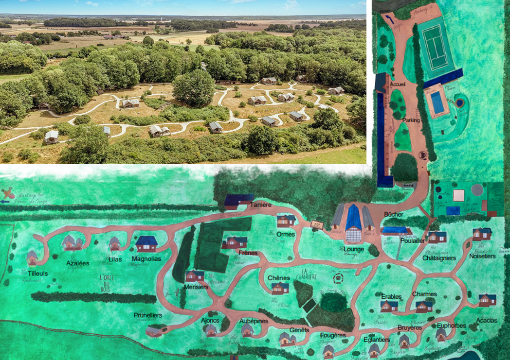 24 hébergements en bois massif, composés d’une pièce de vie avec cuisine équipée, de 2 à 6 chambres et d’1 à 3 salles de douche, répartis comme suit :